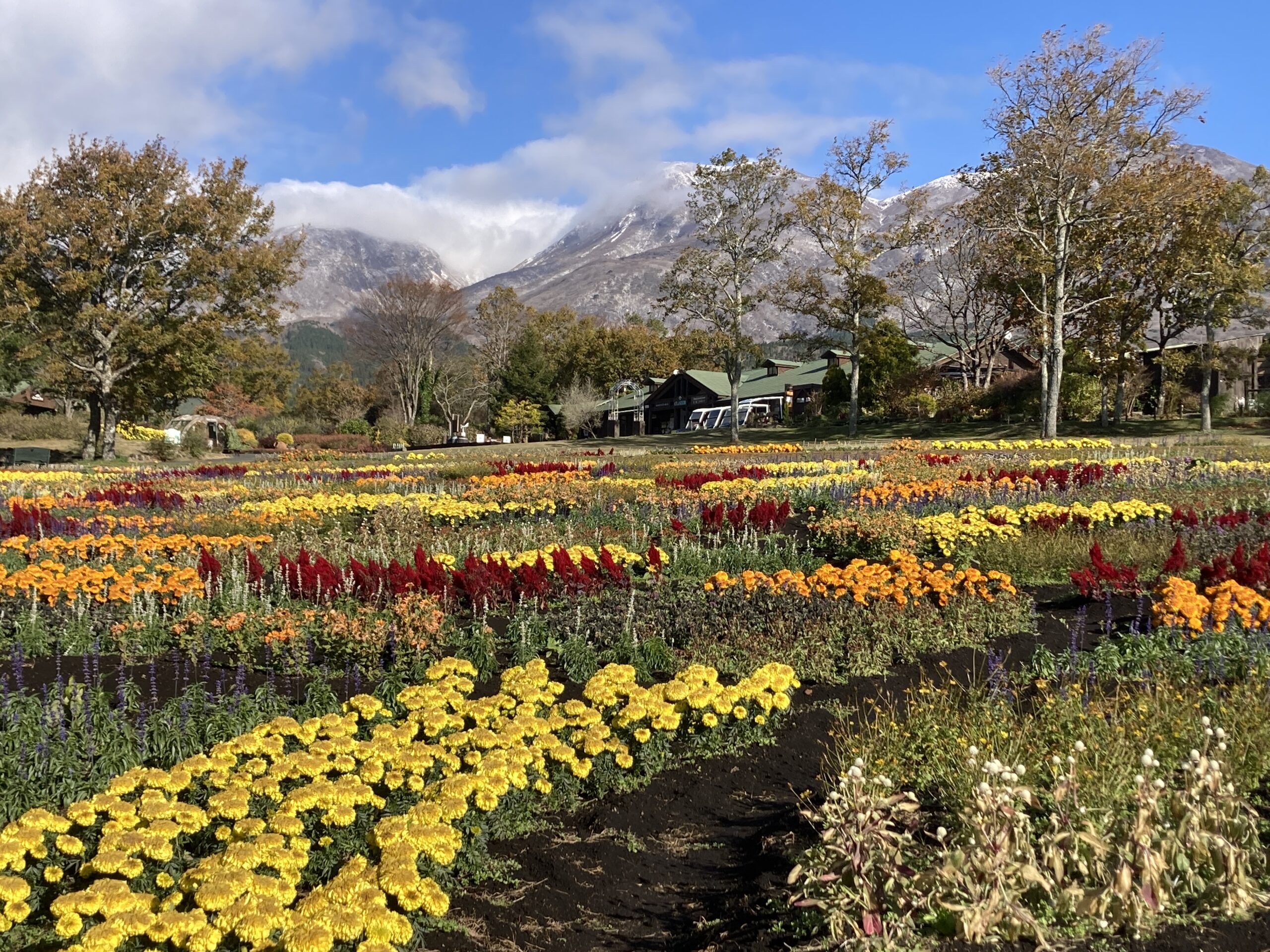 昨日、くじゅう連山は初冠雪で白く雪で覆われいよいよ冬到来! 雪景色の山を背景にまもなく終わりを迎える花畑! 秋の寄せ植えは、霜焼けが進み花の上部の変色が進みました。 マリーゴールドも霜焼けで一気に終わりを迎えました。 サルビアも霜には強い方ですがやはり株が終盤となりかなり散ってしまっています。 ローズガーデンはまだまだ花はありますが雪と強風で傷みがあります。 くじゅうガーデンの花は霜で枯れて終了しています。