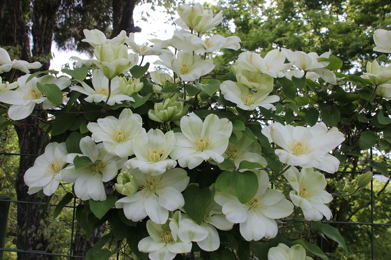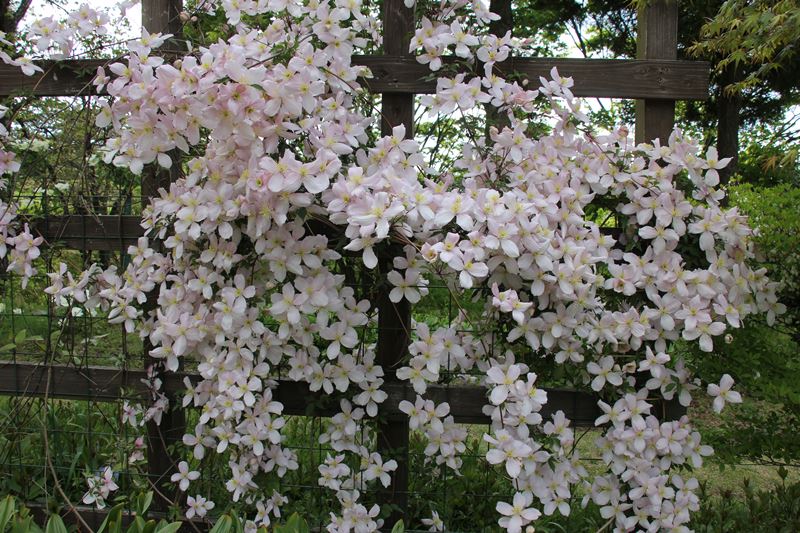 クレマチスガーデンが見頃を迎えました** こんもりと花を咲かせるクレマチス。 ツル植物の女王とも言われています。 花言葉は旅人の喜び * * ↓ ↓ ・ クレマチスガーデンは甘い香りに包まれ、 癒しの空間となっています** ↓ ↓ ・