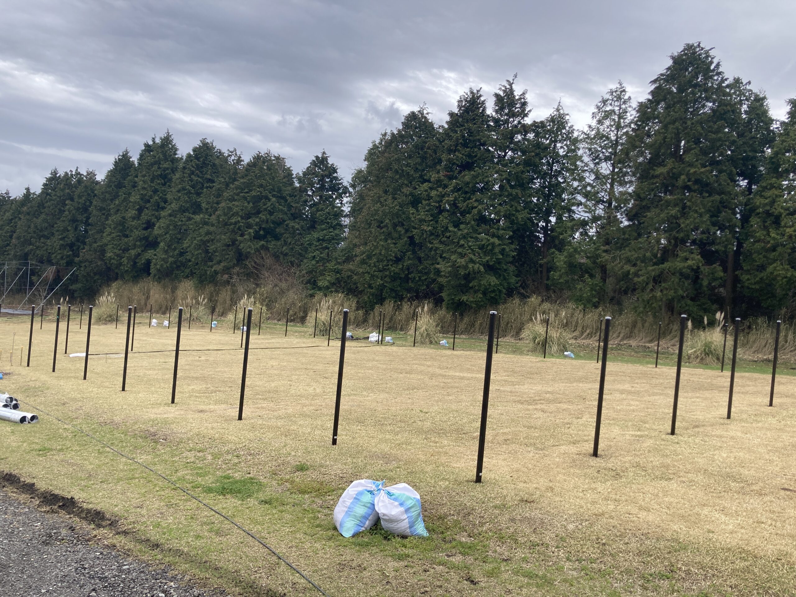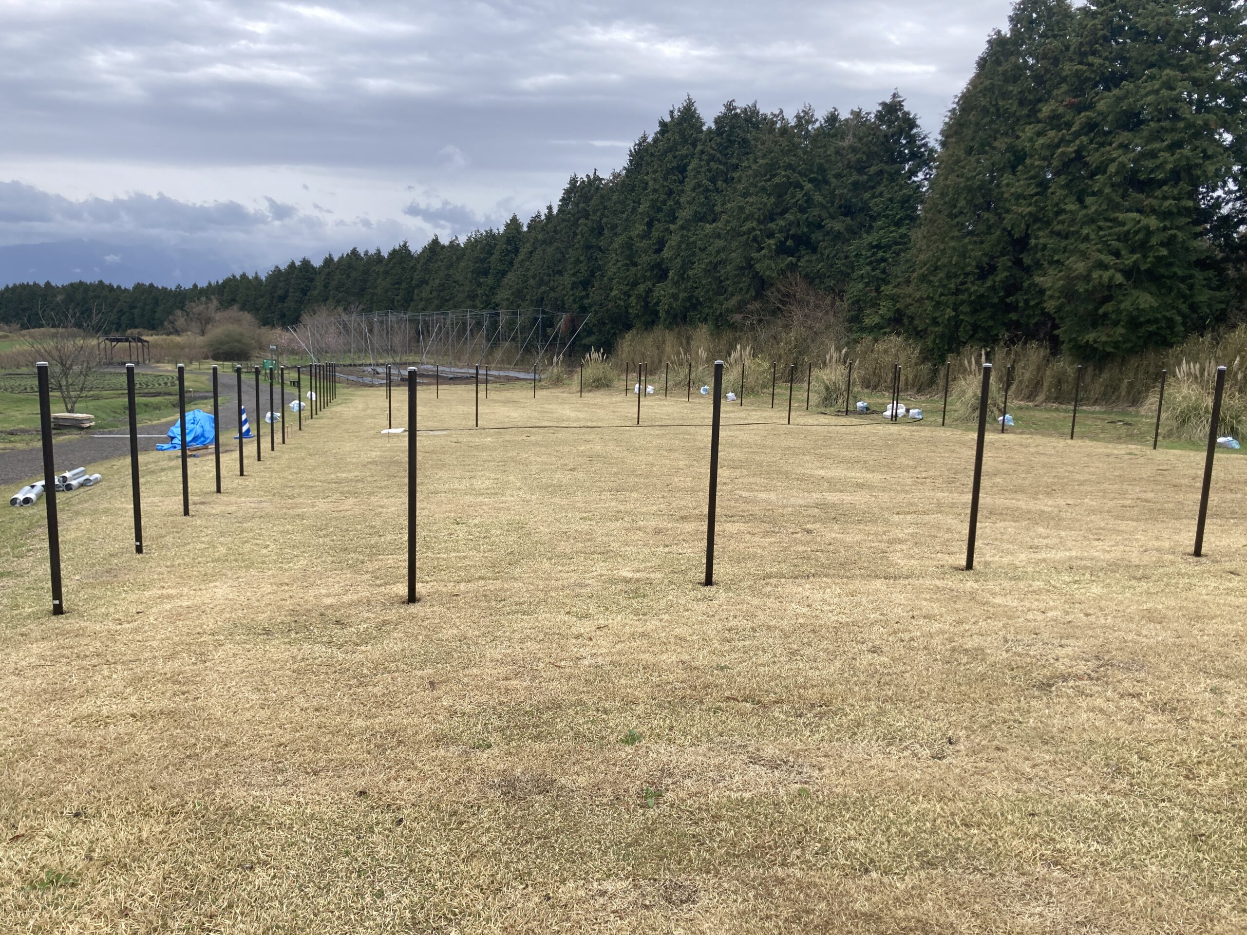 手ぶらキャンプサイトの下でドッグランの設置工事中です。 雨が続きなかなか工事が進まない状況ですが、4/6(土)のお披露目までに 間に合うように業者さんが頑張ってくれています! 支柱の設置が完了したので今日からはフェンス張りの予定だそうです。 フェンス張りが終了しだい、花公園スタッフが水道設置工事を実施します! 今週末は天候が良いので業者さんも休み返上で工事して頂けるそうです。感謝!