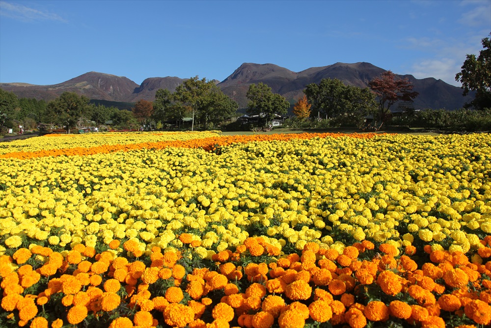 ・ くじゅう連山の頂上から徐々に、 紅葉が深まって行くのが分かります。 ・ 写真では分かりにくいですが、 紅葉で赤く染まったくじゅう連山を背景に、 綺麗なマリーゴールドを楽しむ事ができます** これから霜が降りる時期です。 気象条件によっては、お花が傷む場合があります。 ・
