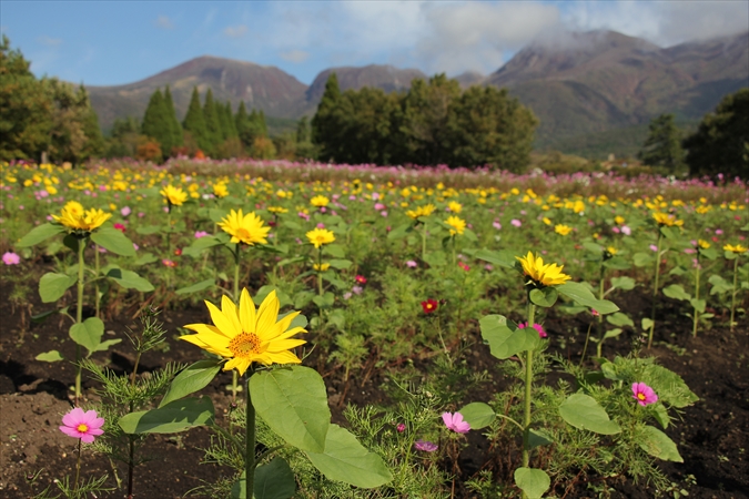 園内そよかぜの丘。 コスモスは綺麗に咲いています。 風は少し、冷たいけれど揺れるコスモスに癒されます。 ↓ ↓ 豪雨で播種が遅れた一部エリアは生育不足となりましたが、 愛らしいミニヒマワリが咲いており、 秋と夏のコラボレーションとなりました。 ↓ ↓