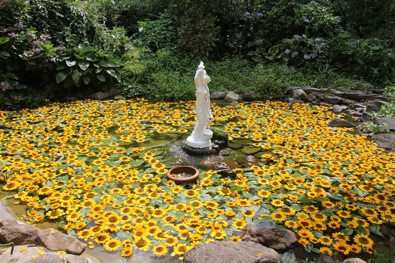 ひまわりがいっぱいの写真スポット** 水の流れる音も心地よくて、涼しげです。 一年間で様々な種類のお花が咲きますが、 ひまわりはパワフルで元気をもらえるお花ですね。