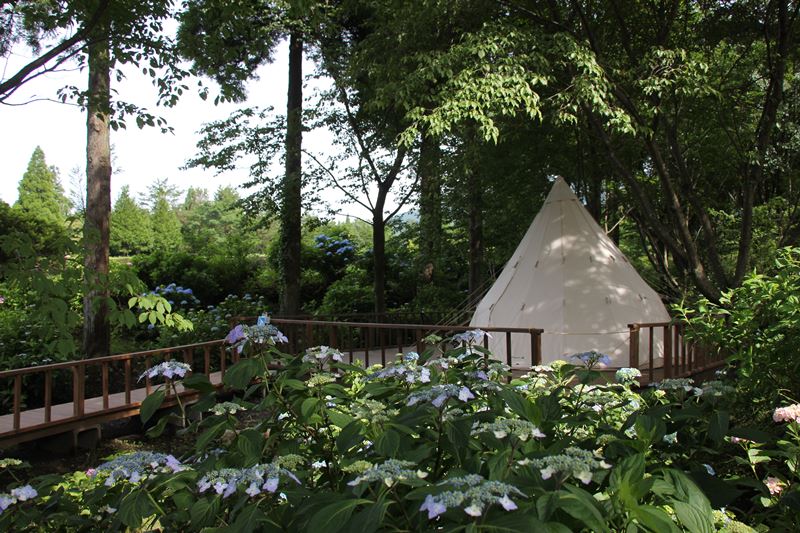キャンピングリゾート「花と星」 究極の1棟 宿泊準備中!! あじさいに囲まれた癒しの空間となっております。 ↓ ↓