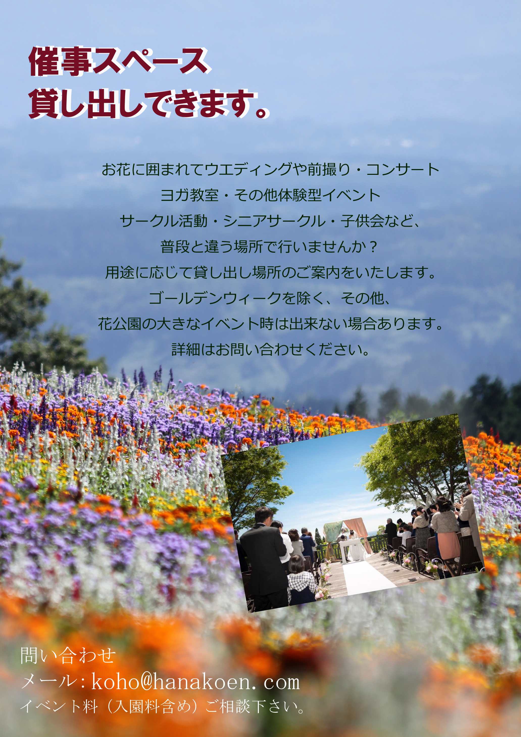 ・ くじゅう花公園では音楽イベントやウエディングなど 大・小様々な催事を受け入れしております。 お花に囲まれたこの大自然の中で、 普段とは違った催事を行いませんか。 詳しくは下記のメールにて問い合わせください。