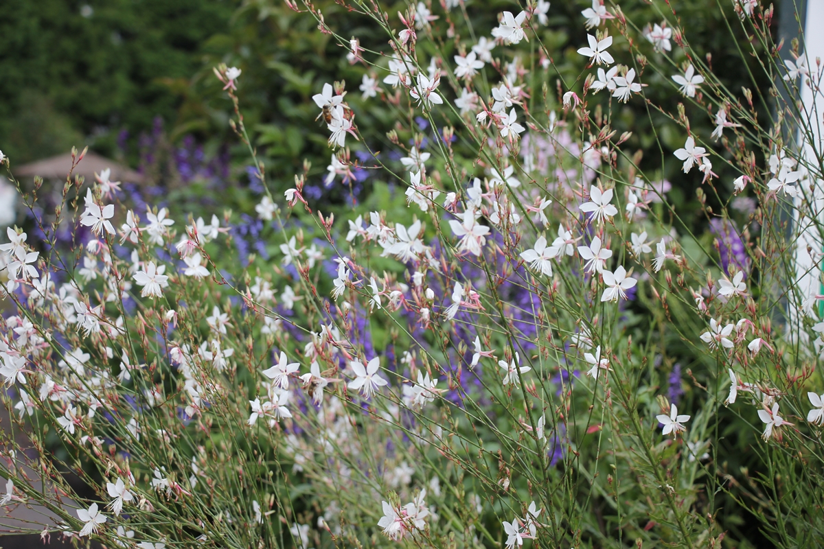 ガウラ 小花が風に流れる様子は、白い蝶が群れて飛んでいるようです。 別名:ハクチョウソウ(白蝶草)と呼ばれています。 また、とても育てやすく、お花は5月~11月と途切れることなく咲き続けます。 久住ガーデンにて見ることができます。探してみてくださいね。