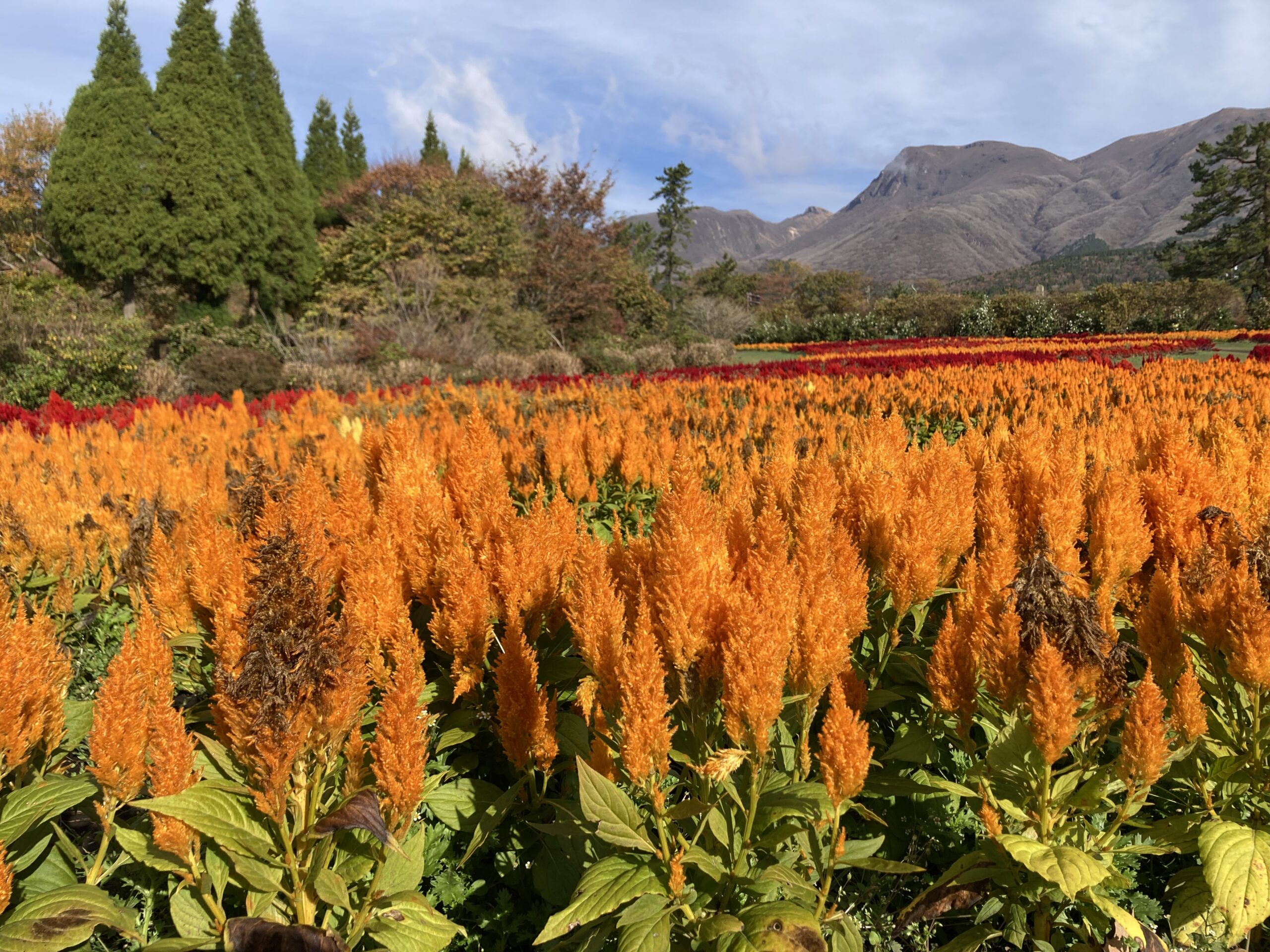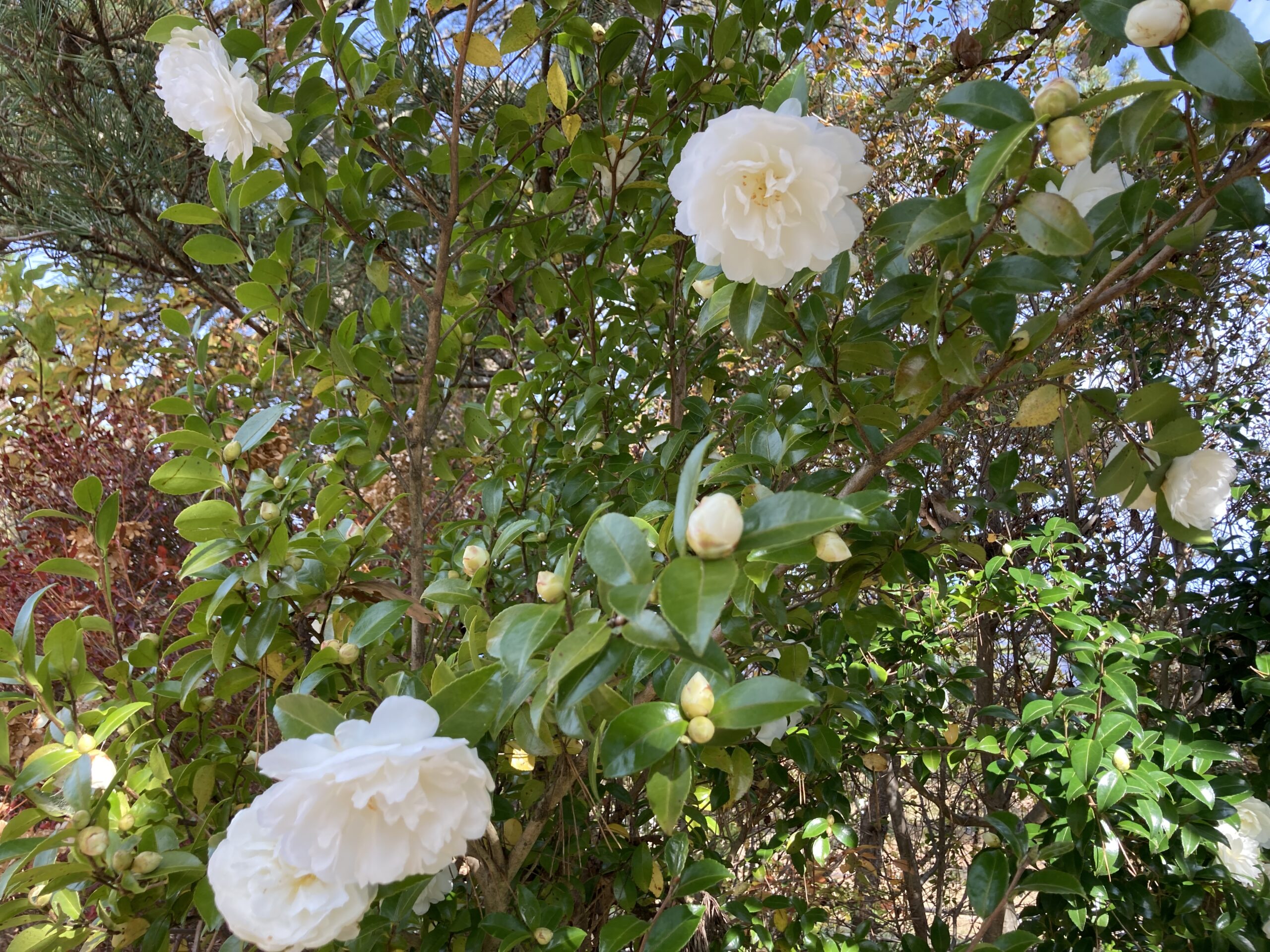 ●ケイトウの畑の上でサザンカがキレイになっています。